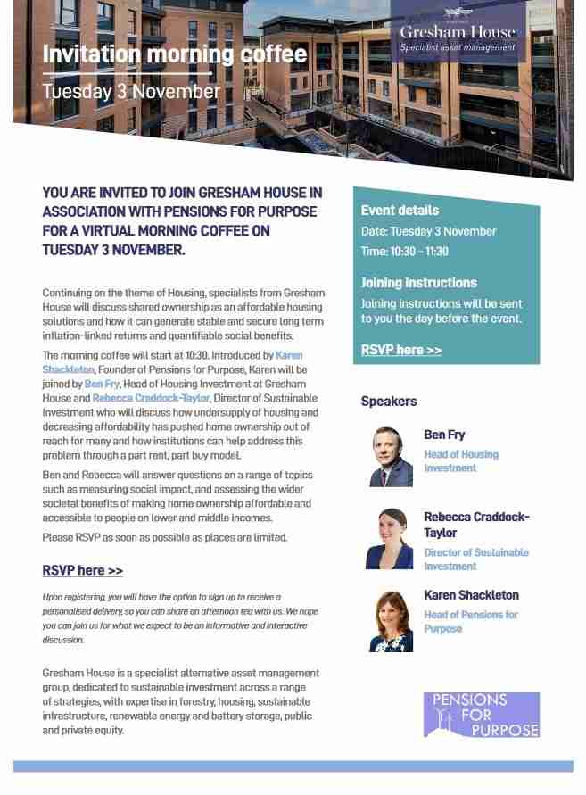 An online discussion hosted jointly by Gresham House and Pensions for Purpose on share ownership as an affordable housing solution.3 November 2020 - Gresham House and Pensions for Purpose morning coffee