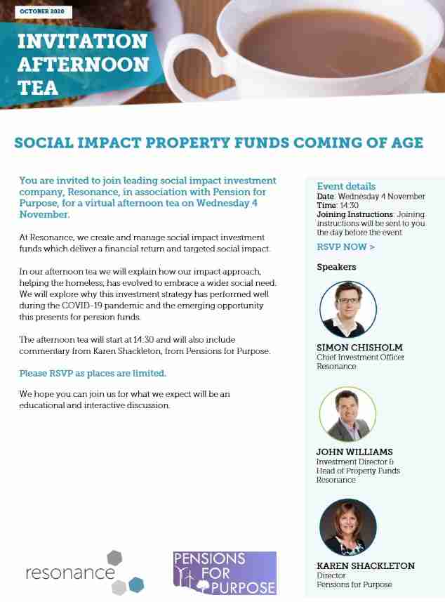 An online discussion hosted jointly by Resonance and Pensions for Purpose on social impact property.4 November 2020 - Resonance and Pensions for Purpose afternoon tea