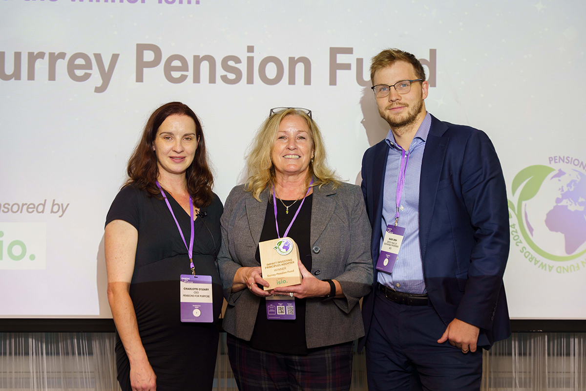 Pensions for Purpose were delighted to recognise Surrey Pension Fund's achievements by presenting them with the Impact Investing Principles Adopter Award, in the Pension Fund Awards, at our recent Annual Symposium & Awards 2024, sponsored by Isio.