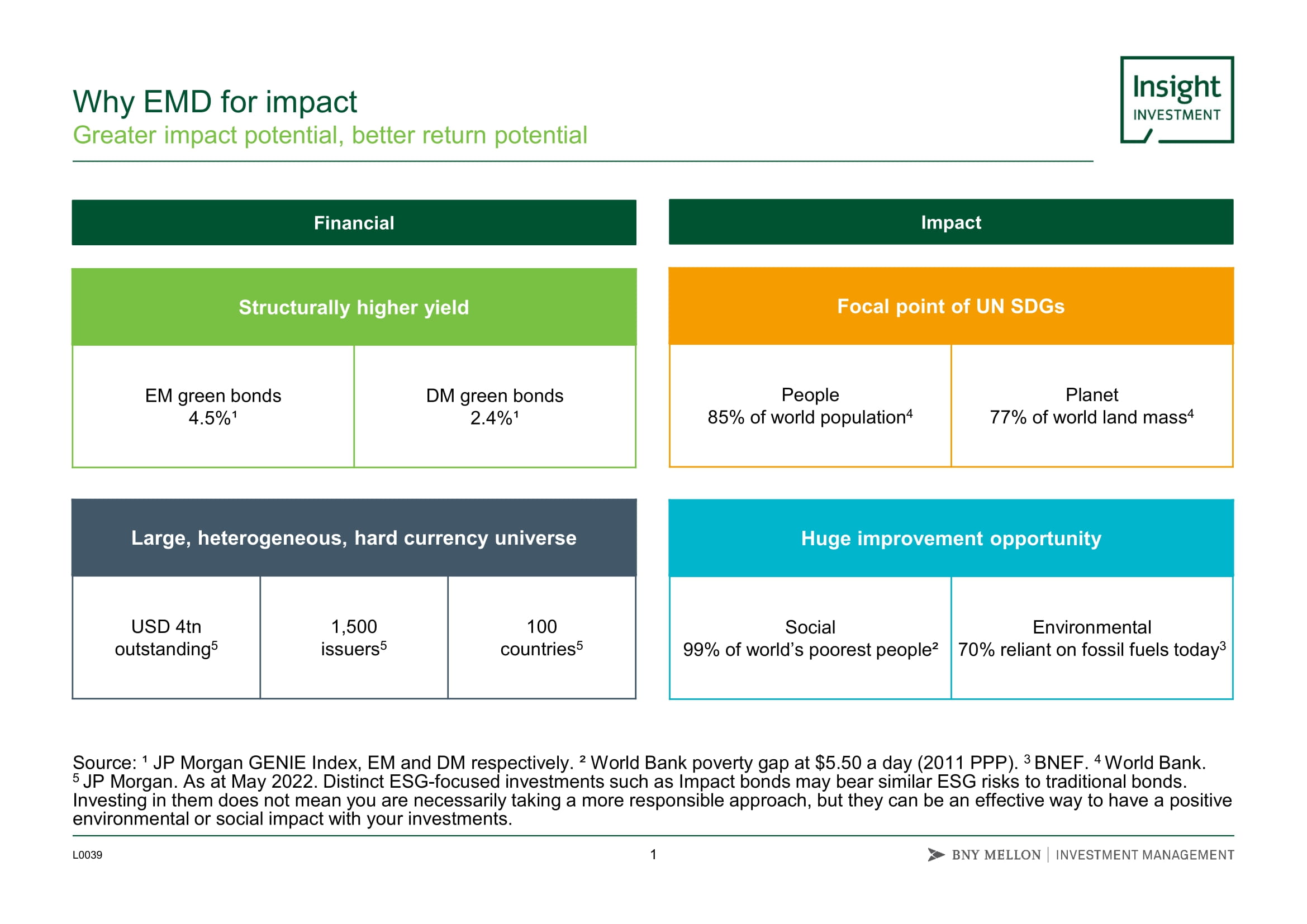 Insight Investment believe the emerging markets offer huge scope for positive environmental and social change and are ripe with opportunities to help with this transition due to the size of the universe (c. $4 trillion of hard currency debt outstanding). However, pension funds still have a duty to pay pensions and, as we enter a period of a higher inflation and rates increases, emerging market corporates offer the highest duration-adjusted yield anywhere in fixed income, with EM green bonds yielding 2% more than developed market green bonds, for only half the duration.
